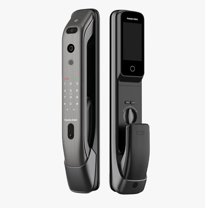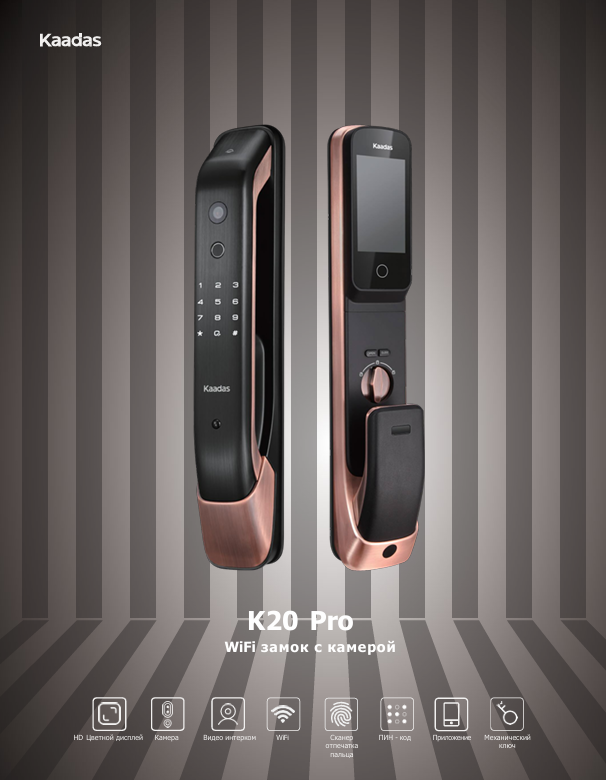 Kaadas K20 Pro — врезной электронный замок премиум класса для любых типов дверей (подходящая глубина полотна — 38–120 мм). Сочетает функции умного замка, видеодомофона и дверного звонка. Открывается по отпечатку пальца, распознаванию лица, паролю, RF карте или механическому ключу. Управление через мобильное приложение.